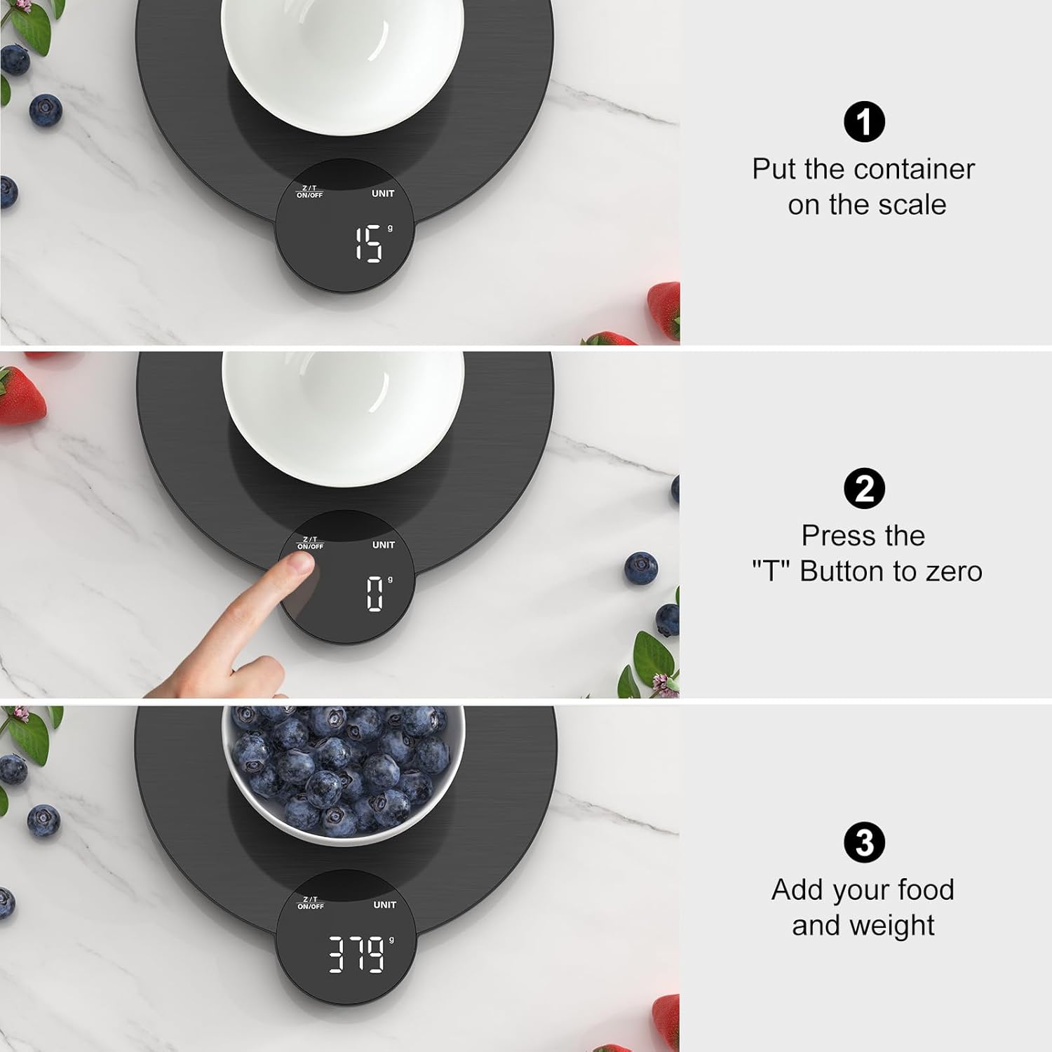 - Battery Included: The food scale is powered by three (3) AAA batteries, which are included. It automatically turns off after 120 seconds of not being used