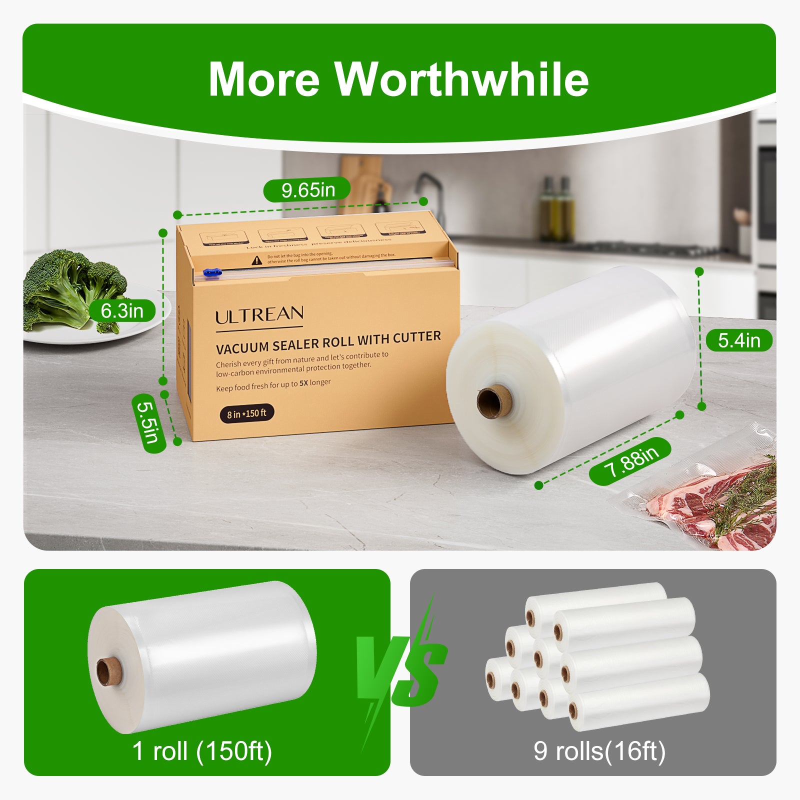 - Hygienic and Easy to Use: The designed cutter box stores the 8" x 150' vacuum seal roll, keeping it dust-free and hygienic. Using the cutter is more convenient than scissors, allowing you to customize the length based on food size and reduce waste